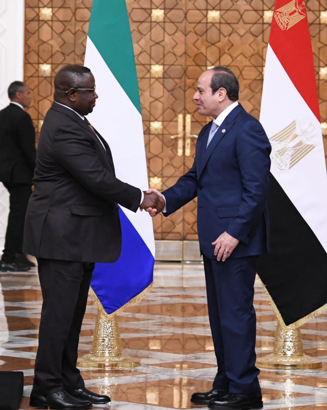 استقبل الرئيس عبد الفتاح السيسي اليوم الخميس، في قصر الاتحادية نظيره السيراليوني الدكتور جوليوس مآدا بيو خلال زيارة رسمية لتعزيز العلاقات الثنائية. بدأت الفعاليات بمراسم استقبال رسمية شملت عزف السلامين الوطنيين واستعراض حرس الشرف.
