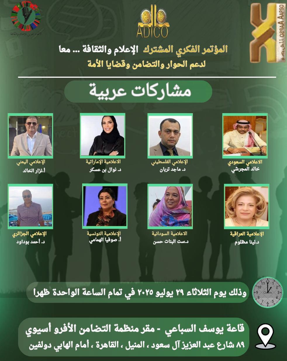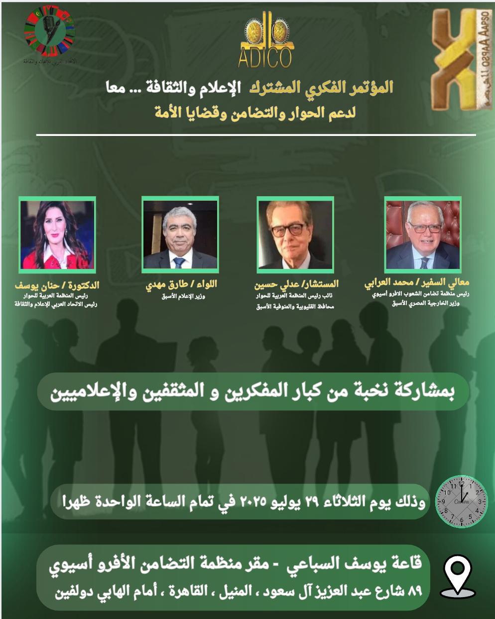 شهدت قاعة يوسف السباعي بمقر منظمة تضامن الشعوب الأفروآسيوية في القاهرة، يوم الثلاثاء 29 يوليو 2025، انعقاد المؤتمر الفكري الأول الذي نظمه الاتحاد العربي للإعلام والثقافة، بالتعاون مع منظمة تضامن الشعوب الأفروآسيوية. المؤتمر، الذي حمل شعار «الإعلام والثقافة.. معًا لدعم الحوار والتضامن وقضايا الأمة»، حقق نجاحًا واضحًا وسط حضور رفيع المستوى من نخبة الإعلاميين والمفكرين والشخصيات السياسية.