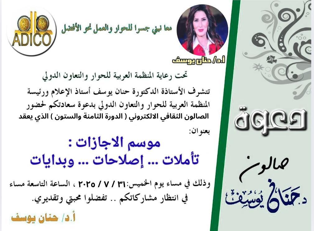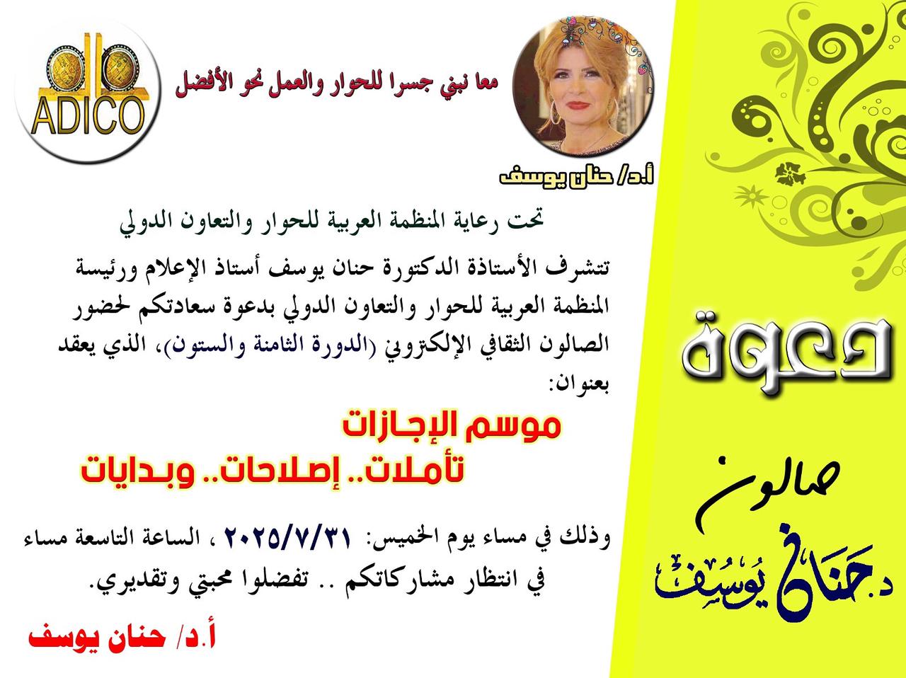 انعقدت مساء أمس الخميس 31 يوليو فعاليات الدورة التاسعة والستين من صالون الدكتورة حنان يوسف الثقافي، تحت عنوان «الإجازات: تأملات، إصلاحات، وبدايات»، بحضور نخبة من الشخصيات البارزة والأكاديميين والإعلاميين من مختلف أنحاء العالم العربي.