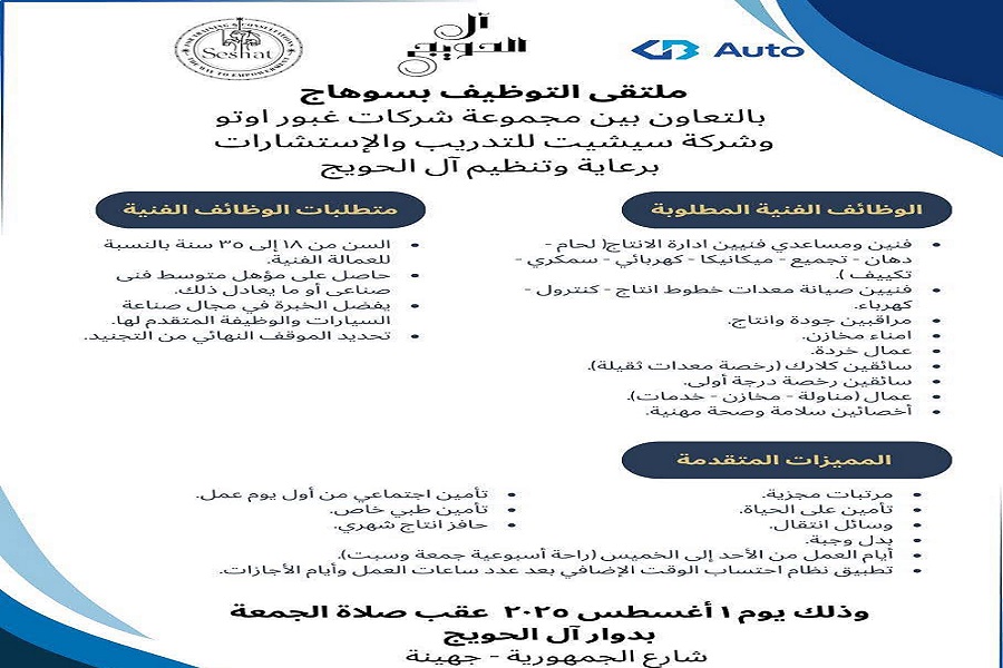 نظّمت مؤسسة سيشيت للتدريب والاستشارات، بالتعاون مع مجموعة شركات غبور أوتو، ملتقى توظيفي بمحافظة سوهاج، وذلك في إطار دعم جهود التنمية المجتمعية وتوفير فرص العمل للشباب في محافظات الصعيد.