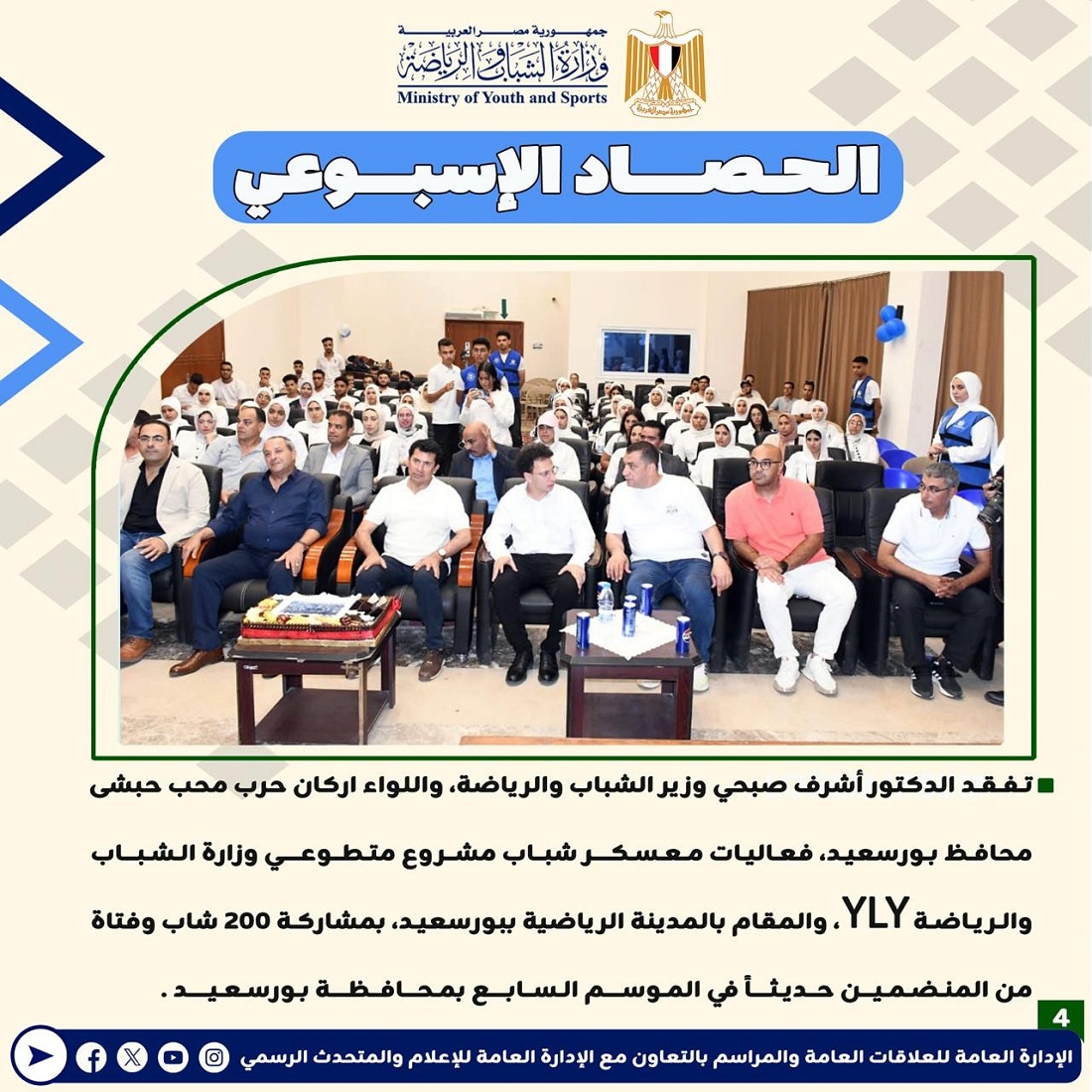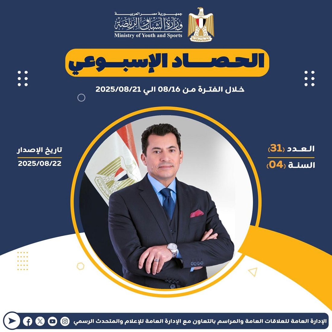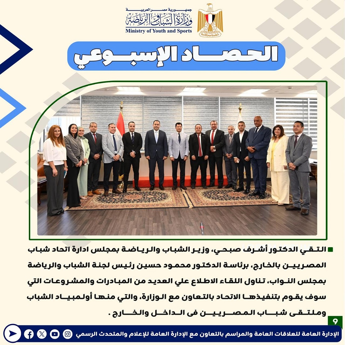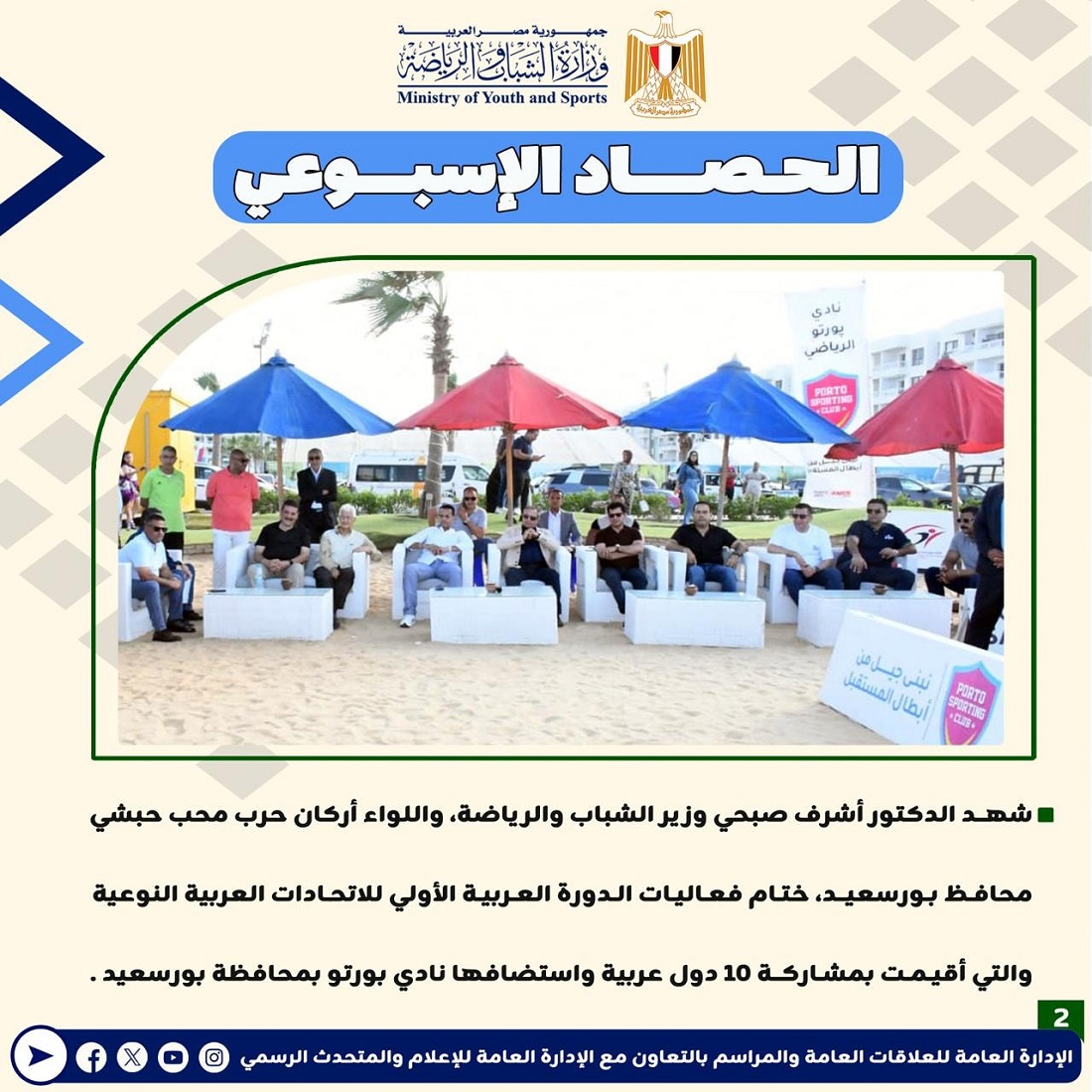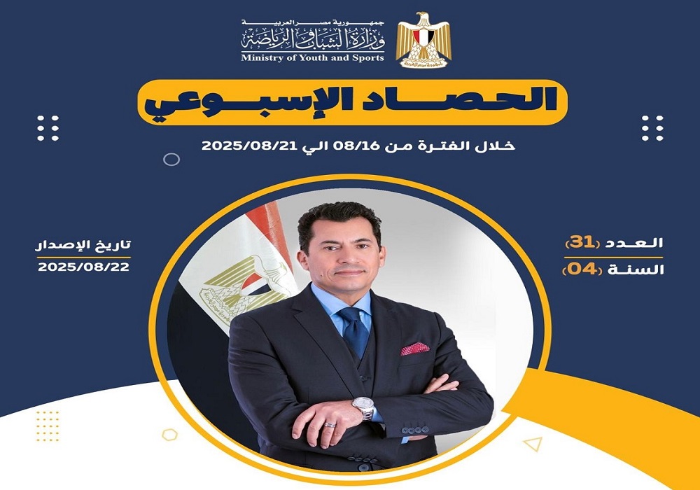 أعلنت وزارة الشباب والرياضة عن إصدارها للتقرير الأسبوعي المصحوب بالإنفوجراف، والذي يقدم عرضًا شاملًا لأهم الأنشطة والاجتماعات الرسمية التي قام بها الدكتور أشرف صبحي، وزير الشباب والرياضة.