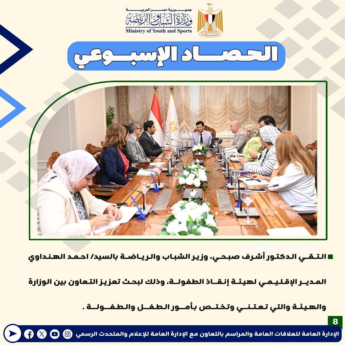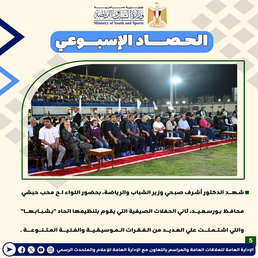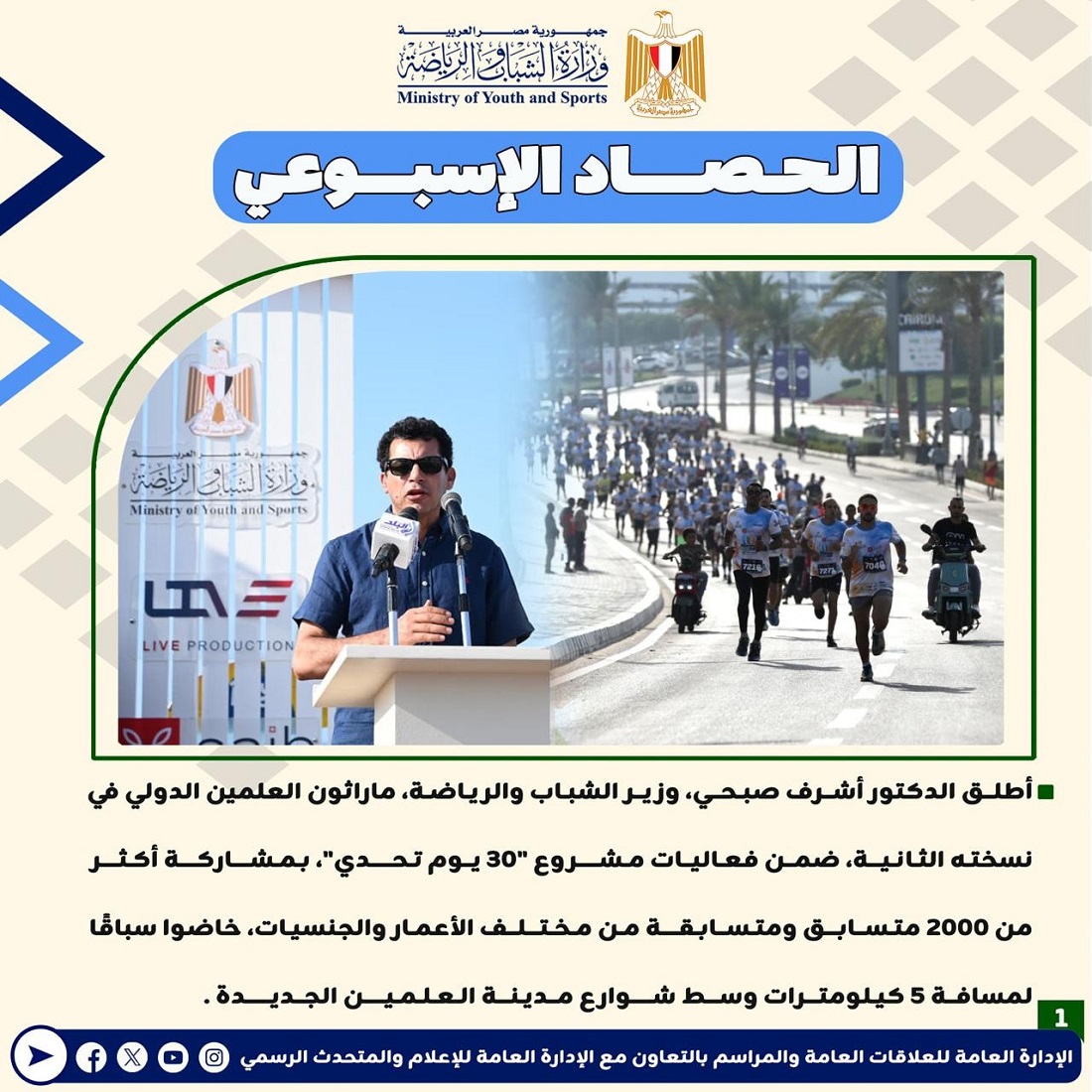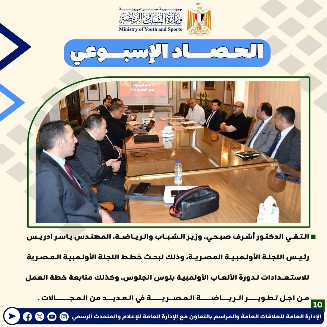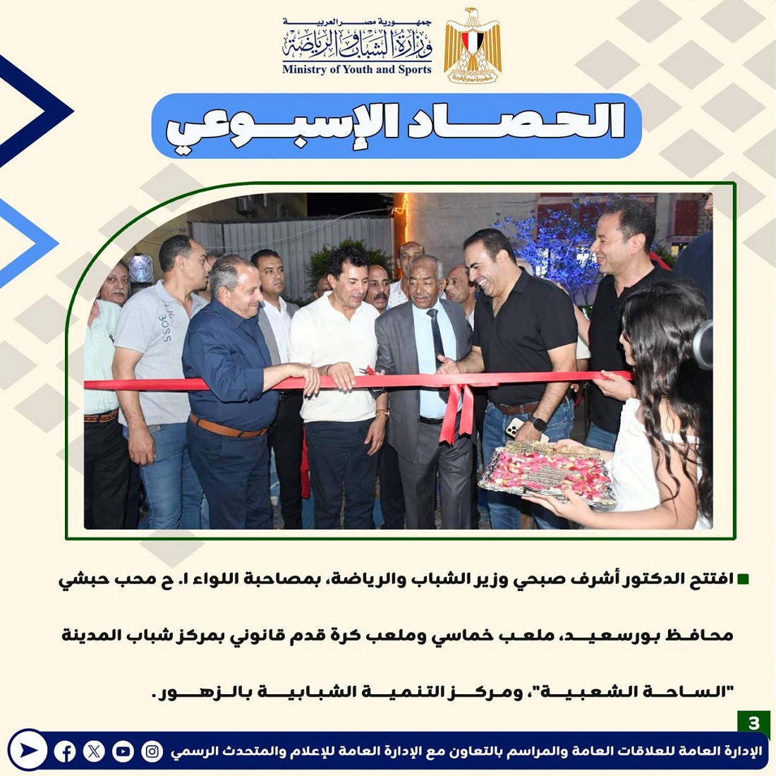 أعلنت وزارة الشباب والرياضة عن إصدارها للتقرير الأسبوعي المصحوب بالإنفوجراف، والذي يقدم عرضًا شاملًا لأهم الأنشطة والاجتماعات الرسمية التي قام بها الدكتور أشرف صبحي، وزير الشباب والرياضة.