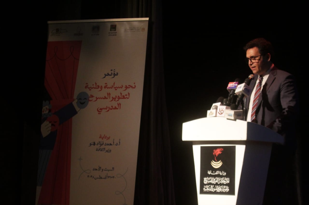 وأكد أن المسرح المدرسي يُعتبر منصة تربوية وثقافية تهدف إلى بناء شخصية الإنسان المصري من خلال تعزيز قيم الانتماء، التفكير النقدي، والعمل الجماعي، كما دعا إلى ضرورة صياغة سياسة وطنية متكاملة للمسرح المدرسي تشمل إعداد دليل فني يحتوي على نصوص مسرحية مناسبة وإرشادات تربوية للإخراج.