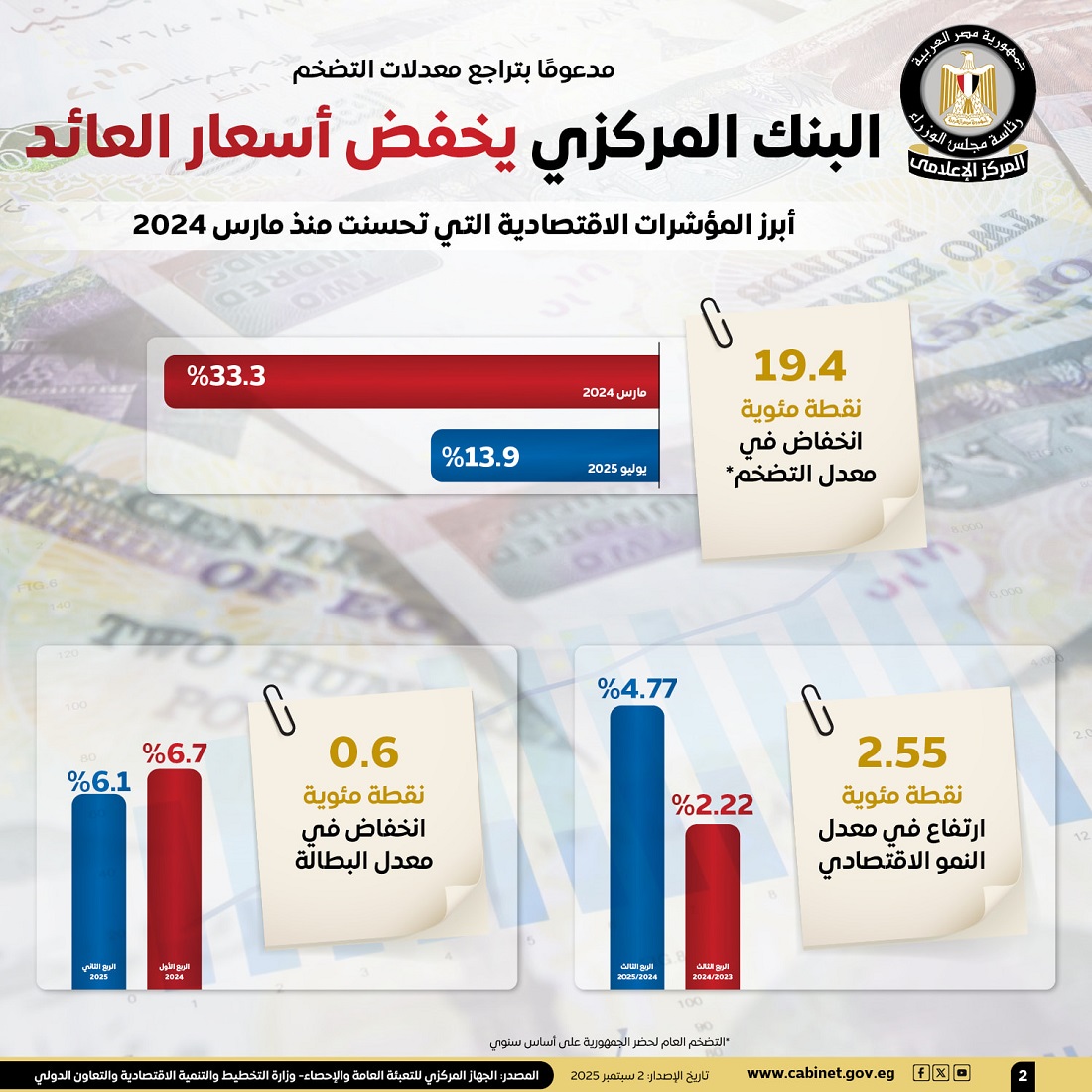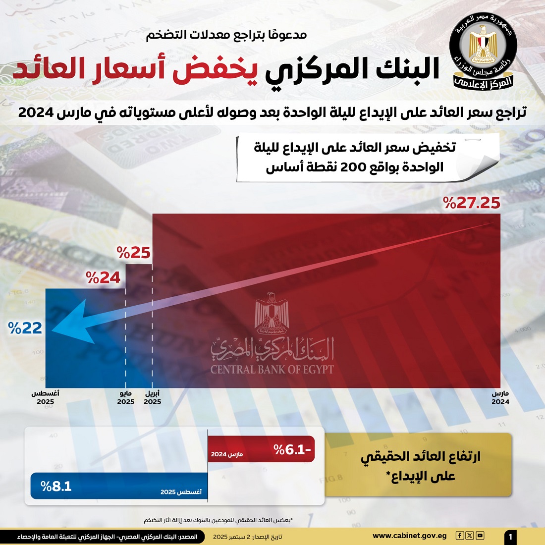 نشر المركز الإعلامي لمجلس الوزراء مجموعة من الإنفوجرافات عبر منصاته على وسائل التواصل الاجتماعي لتسليط الضوء على قرار البنك المركزي المصري بخفض أسعار العائد.