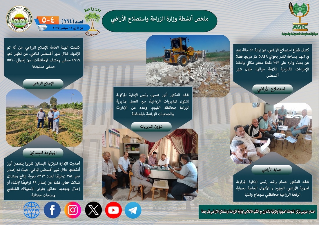 أصدر مركز المعلومات الصوتية والمرئية بـ وزارة الزراعة واستصلاح الأراضي، «الانفوجراف الأسبوعي» في نسخته رقم 264 حول الحصاد الاسبوعي لأهم أنشطة الوزارة، خلال الاسبوع الماضي في الفترة من 5 وحتى 11 سبتمبر الجاري، كما أصدر المركز ايضا ملخصا بالفيديو، حول انشطة الوزارة خلال نفس الفترة.