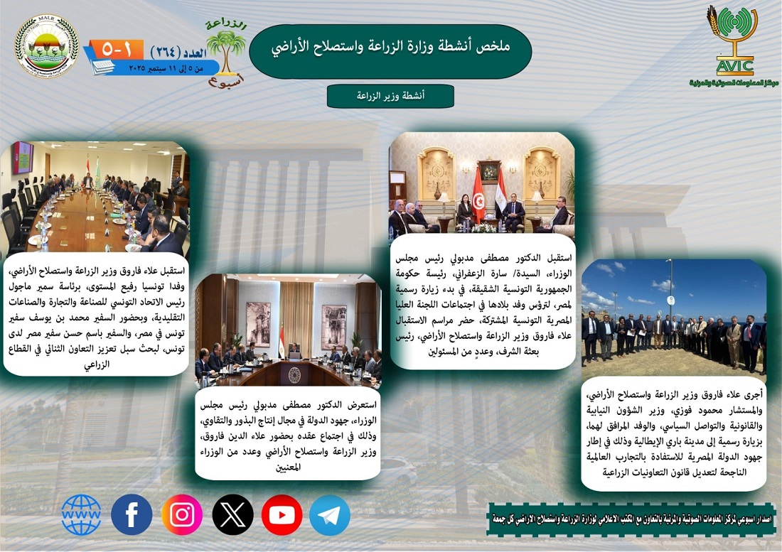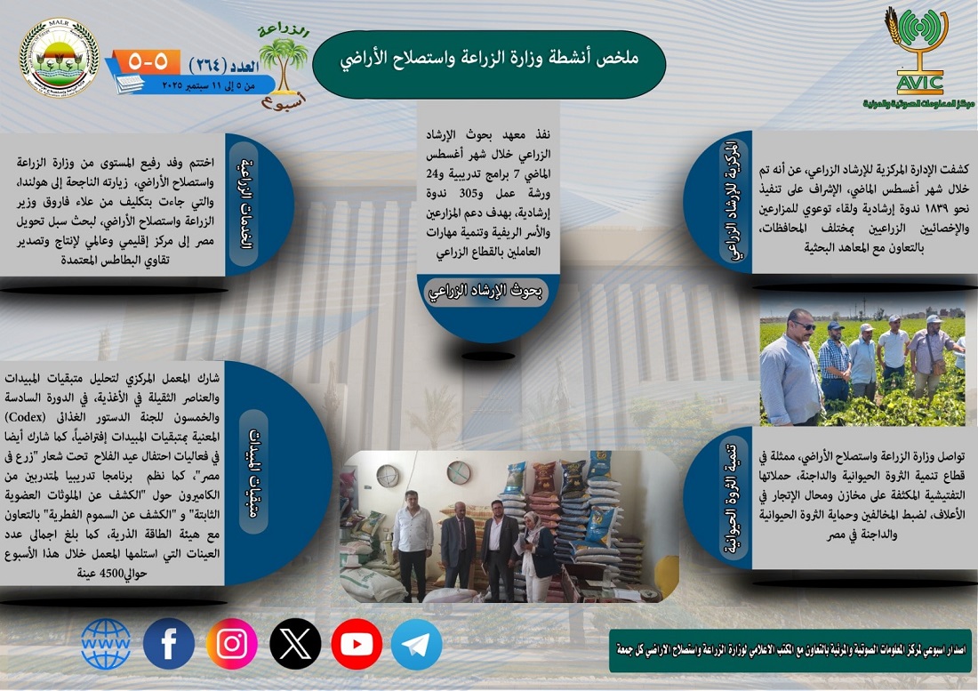 يذكر ان مركز المعلومات الصوتية والمرئية، والمكتب الاعلامي للوزارة، يصدران الجمعة من كل اسبوع، انفوجرافا وفيديو باسم: الزراعة في اسبوع، لالقاء الضوء على ملخص ما تم من انشطة وجهود، بكافة القطاعات والهيئات، التابعة للوزارة، فضلا عن انفوجراف وفيديو كل ثلاثاء باسم: الزراعة في كل مصر، حول انشطة وجهود القطاع الزراعي، بالمحافظات المختلفة.