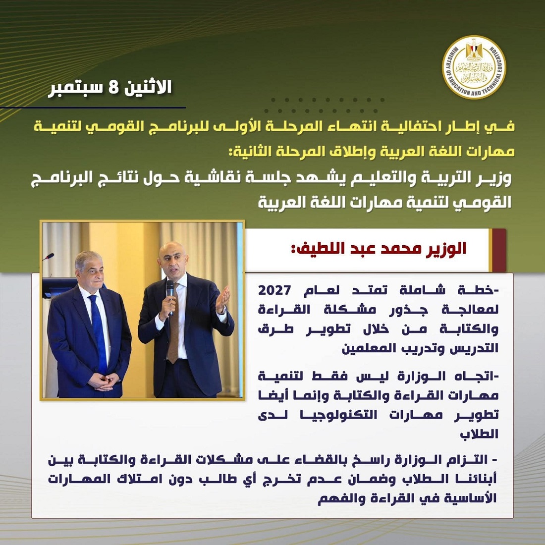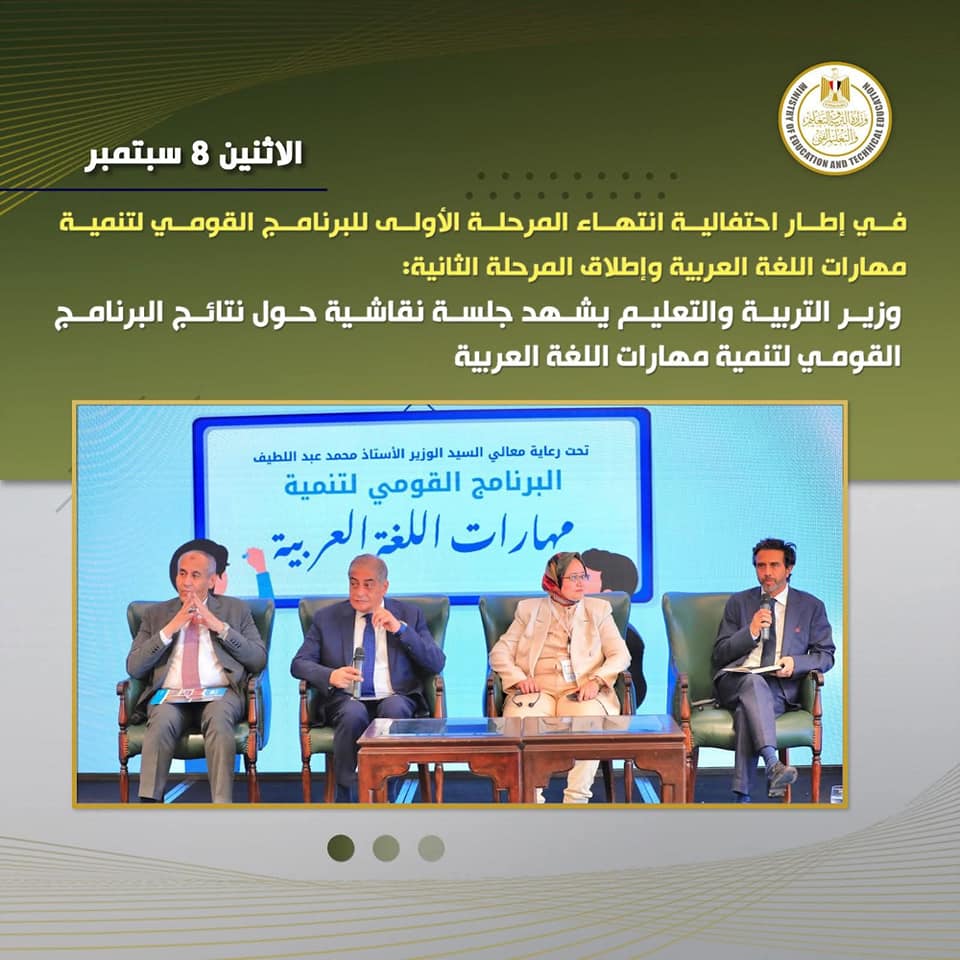 وشهدت الجلسة النقاشية إطلاق المرحلة الثانية من البرنامج القومى لتنمية مهارات اللغة العربية، والتى تم التأكيد فيها على تحفيز المعلمين المشاركين بالبرنامج، بجانب دعم البرنامج القومى لتنمية مهارات اللغة العربية وتطبيقه بالمحافظات الأخرى ليشمل جميع محافظات الجمهورية، وإدراج الطلاب ذوى الهمم بالمرحلة القادمة.
