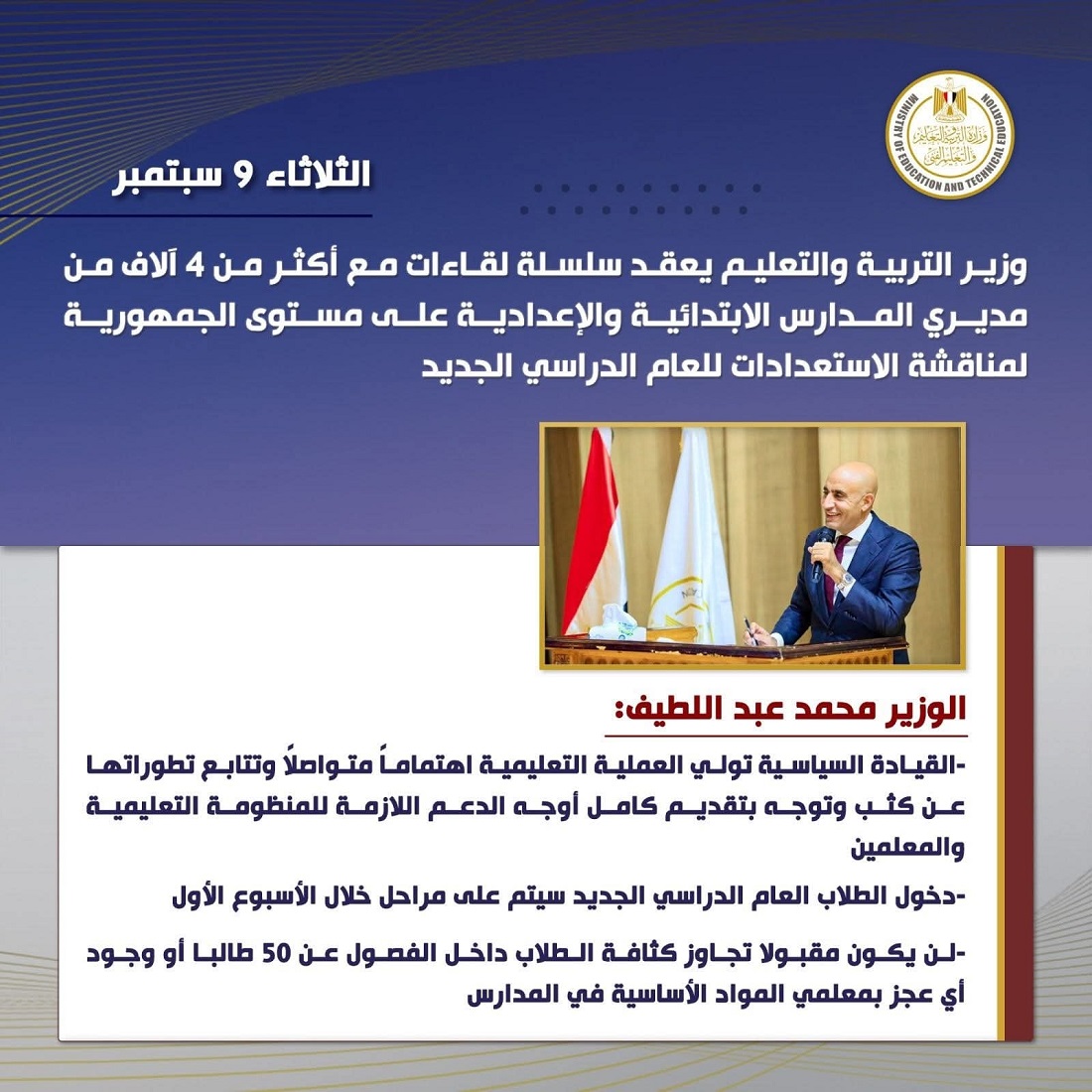 عقد محمد عبد اللطيف وزير التربية والتعليم والتعليم الفني، سلسلة لقاءات موسعة مع أكثر من ٤ آلاف من مديري المدارس الابتدائية والإعدادية على مستوى الجمهورية؛ فضلا عن حضور مديري المديريات والإدارات التعليمية على مستوى الجمهورية، وذلك لمناقشة آخر المستجدات الخاصة ببدء العام الدراسي الجديد 2025 / 2026، واستعراض خطوات تطوير العملية التعليمية.