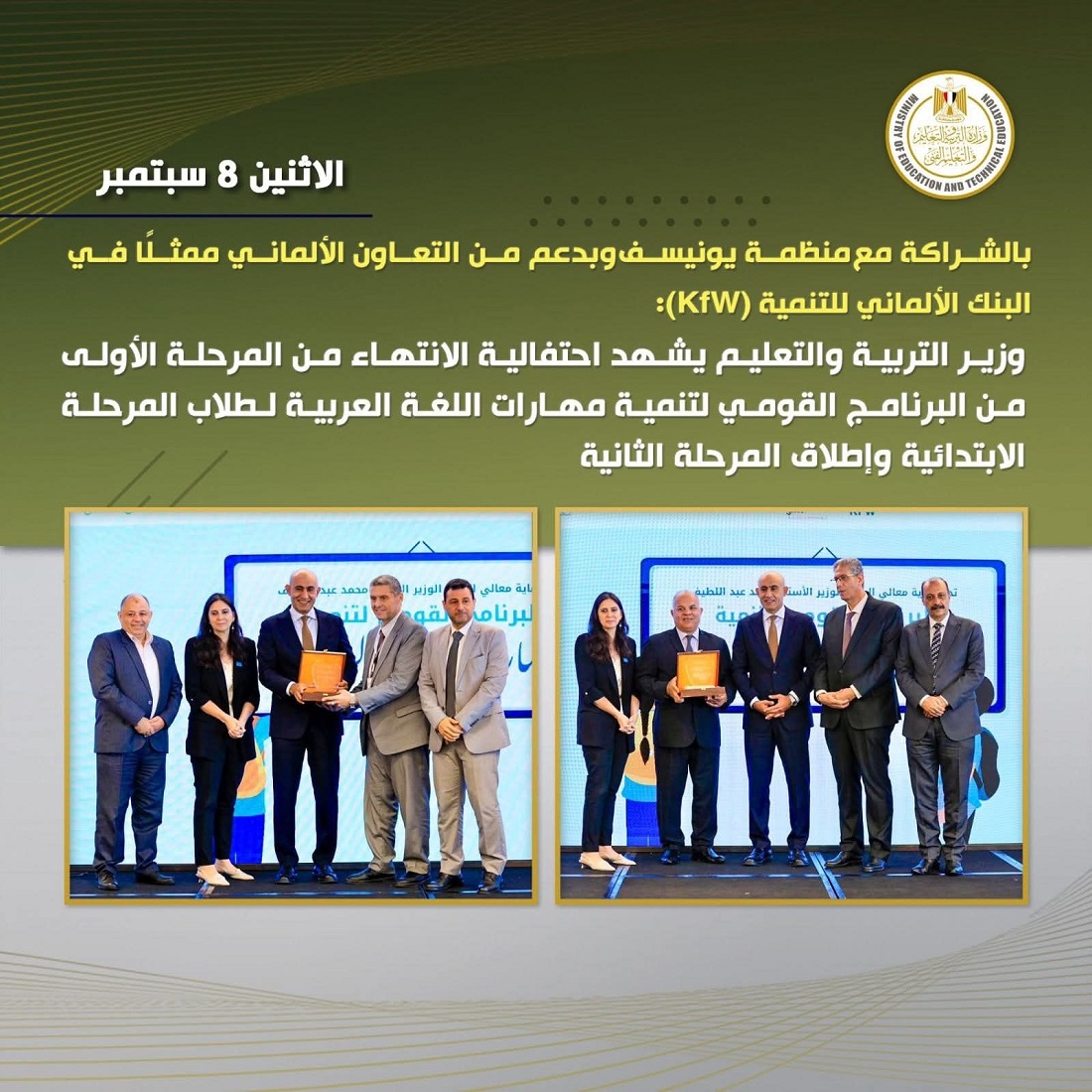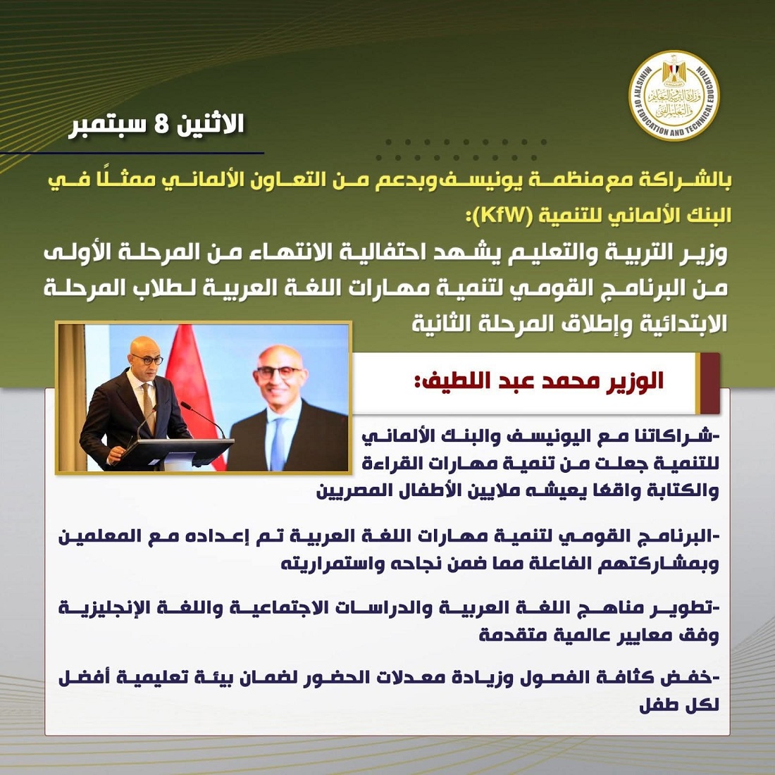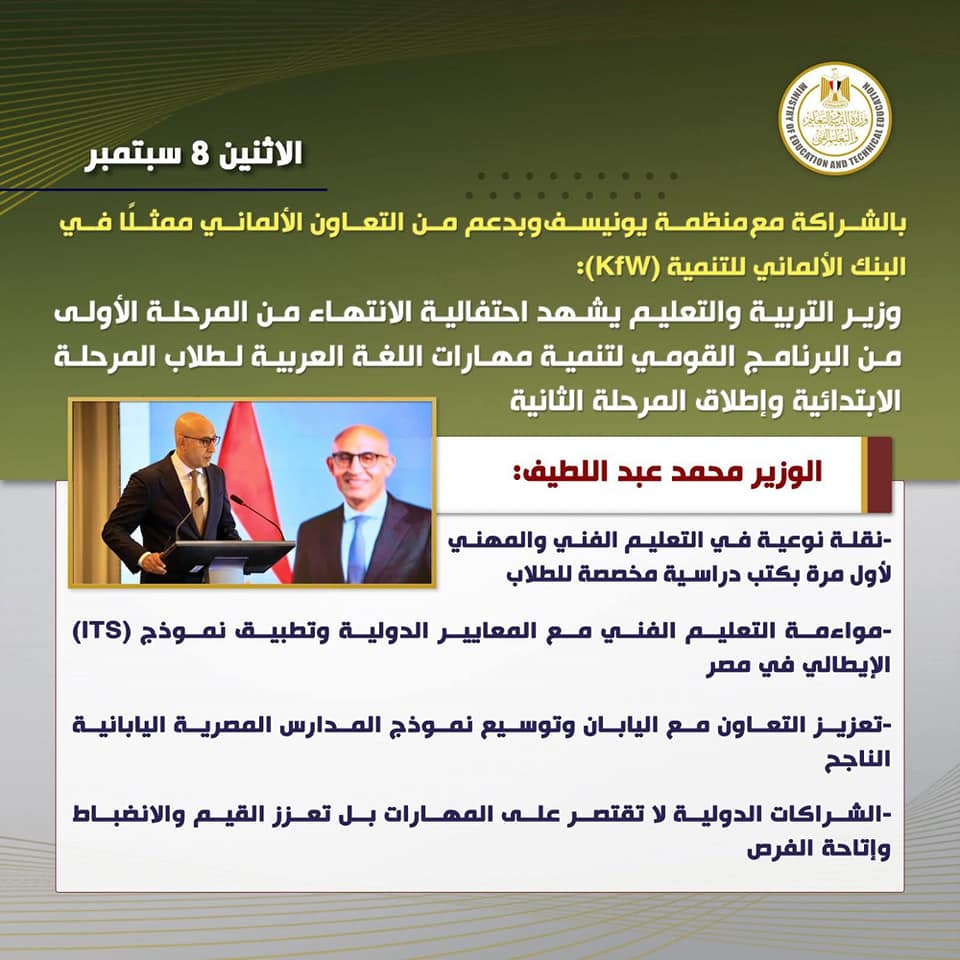 شهد محمد عبد اللطيف وزير التربية والتعليم والتعليم الفنى احتفالية الانتهاء من المرحلة الأولى من البرنامج القومى لتنمية مهارات اللغة العربية لطلاب المرحلة الابتدائية وإطلاق المرحلة الثانية، بالشراكة مع منظمة يونيسف وبدعم من التعاون الألماني ممثلًا في البنك الألماني للتنمية (KfW).
