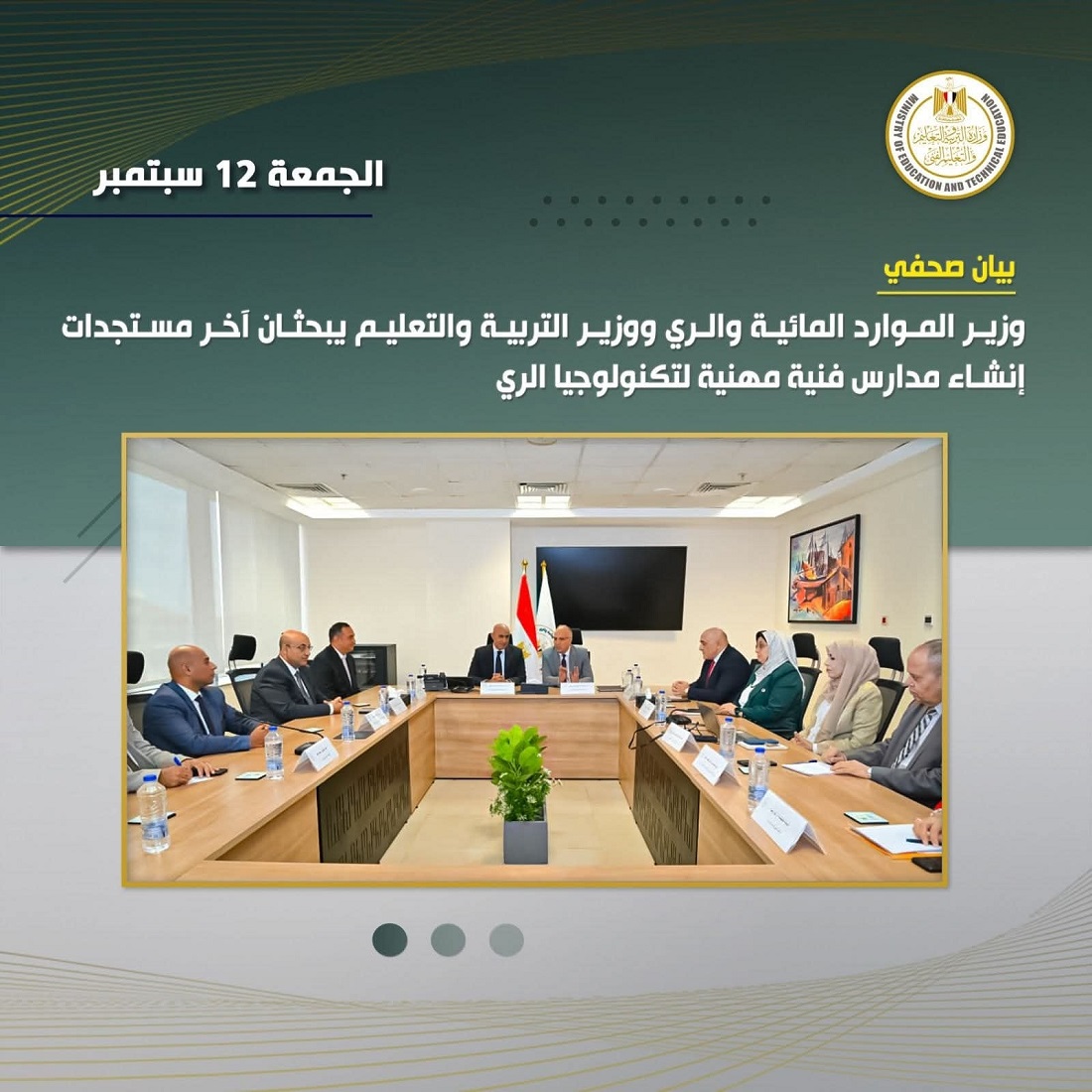 وتم خلال الإجتماع عرض آخر المستجدات فى مجال إنشاء “مدارس فنية مهنية لتكنولوجيا الري” والتى ستقدم مناهج دراسية فريدة من نوعها تجمع بين التعليم الأكاديمي والممارسة العملية، بهدف إعداد وتطوير كوادر فنية متخصصة لشغل الوظائف الفنية المطلوبة في السنوات القادمة من خلال مركز التدريب الإقليمي التابع لوزارة الموارد المائية والري، وكذلك إعداد مناهج متكاملة في مجالات الري والصرف وشبكات الري الحديثة والمساحة وتقنيات الذكاء الاصطناعي وصيانة وتشغيل الطلمبات والمعدات المتخصصة والسيارات .