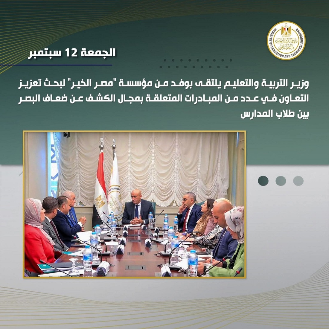 وأعرب الوزير، خلال الاجتماع، عن تطلعه إلى تعزيز التعاون مع مؤسسة “مصر الخير” وبالتكامل مع منظمات المجتمع المدني، في عدد من المحاور المهمة، من بينها مبادرة للكشف عن ضعف البصر بين طلاب المدارس وتوفير النظارات الطبية لهم بالمجان، إلى جانب توعية أولياء الأمور بأهمية الكشف المبكر على أبنائهم لضمان تحسين تحصيلهم الدراسي، خاصة في المناطق الأكثر احتياجًا.