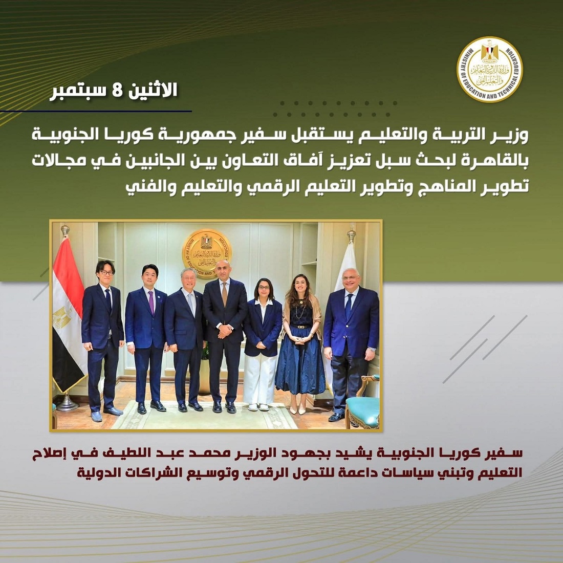 وأعرب الوزير عن تطلع الوزارة إلى تعزيز التعاون مع الجانب الكوري الجنوبي في تطوير المناهج، فضلا عن تعزيز التعاون في إعداد كوادر فنية مدربة وفقًا لأحدث المعايير العالمية من خلال تنفيذ خطة الوزارة التي تستهدف تحويل ما يقرب من 1270 مدرسة فنية إلى مدارس تكنولوجية تطبيقية ومدارس للتعليم المزدوج، في إطار التحول التدريجي نحو نماذج تعليمية تقوم على الجودة والالتزام بالمعايير الدولية.