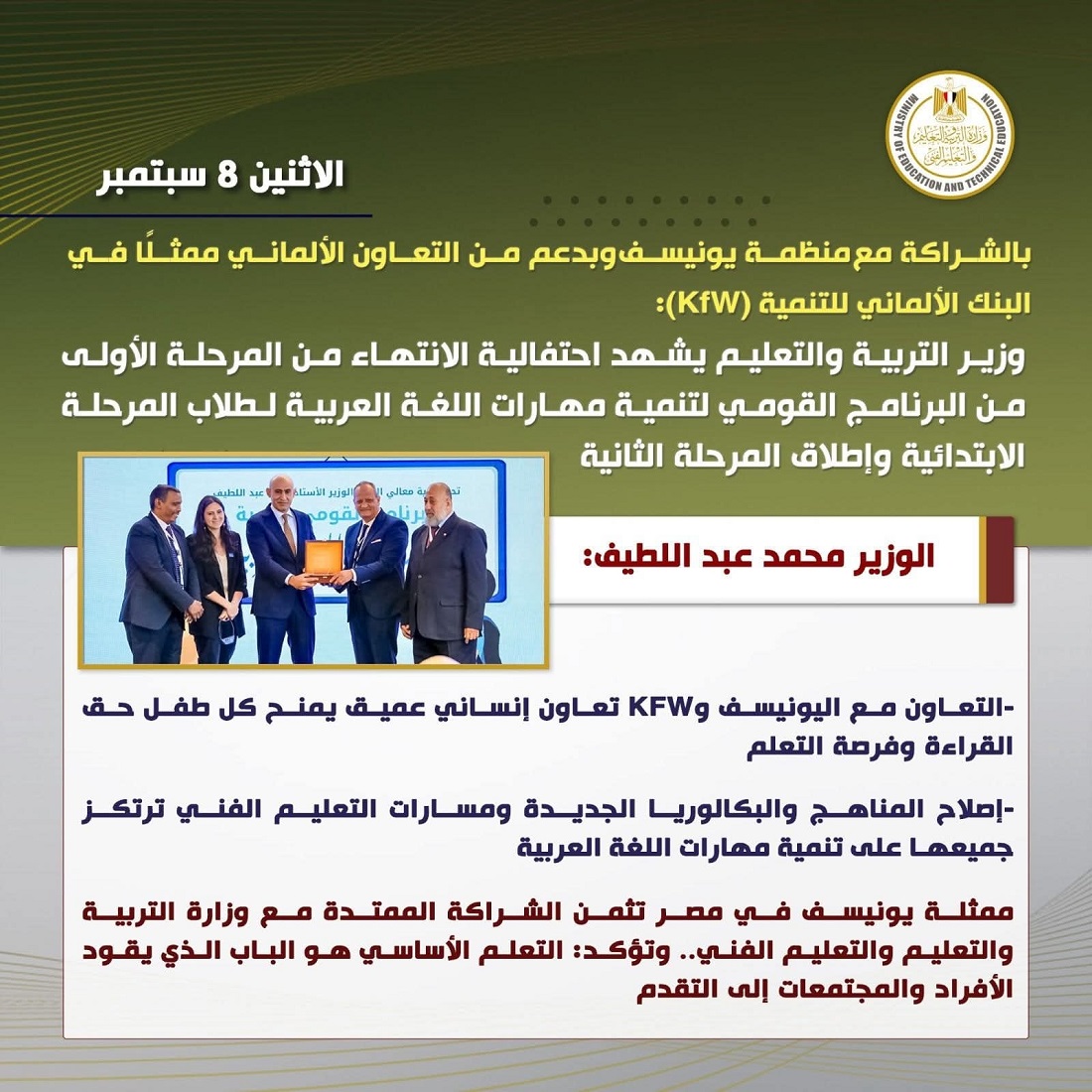 وتوجه الوزير محمد عبد اللطيف بالشكر إلى اليونيسف، وبنك التنمية الألماني (KFW)، وجميع المتعاونين الذين عملوا مع الوزارة عن قرب من أجل تعزيز المهارات الأساسية، مؤكدًا أن هذا التعاون ليس في الجانب التقني فقط، بل هو تعاون إنساني عميق، فمعًا، نمنح كل طفل حق القراءة، وفرصة التعلم، والثقة في النجاح.