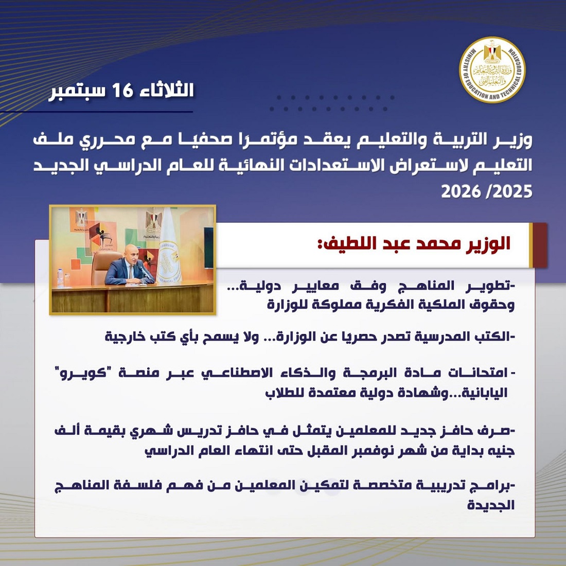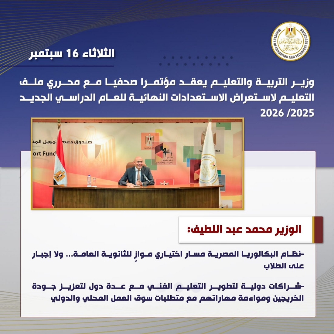 واختتم السيد الوزير مؤكداً أن استراتيجية الوزارة تقوم على تنويع وتطوير مسارات التعليم وإتاحة فرص تعليمية متوازنة تواكب التطورات العالمية وتلبي طموحات أبنائنا الطلاب وأسرهم، بما يسهم في بناء جيل مؤهل للمستقبل وقادر على المنافسة إقليميًا ودوليًا.