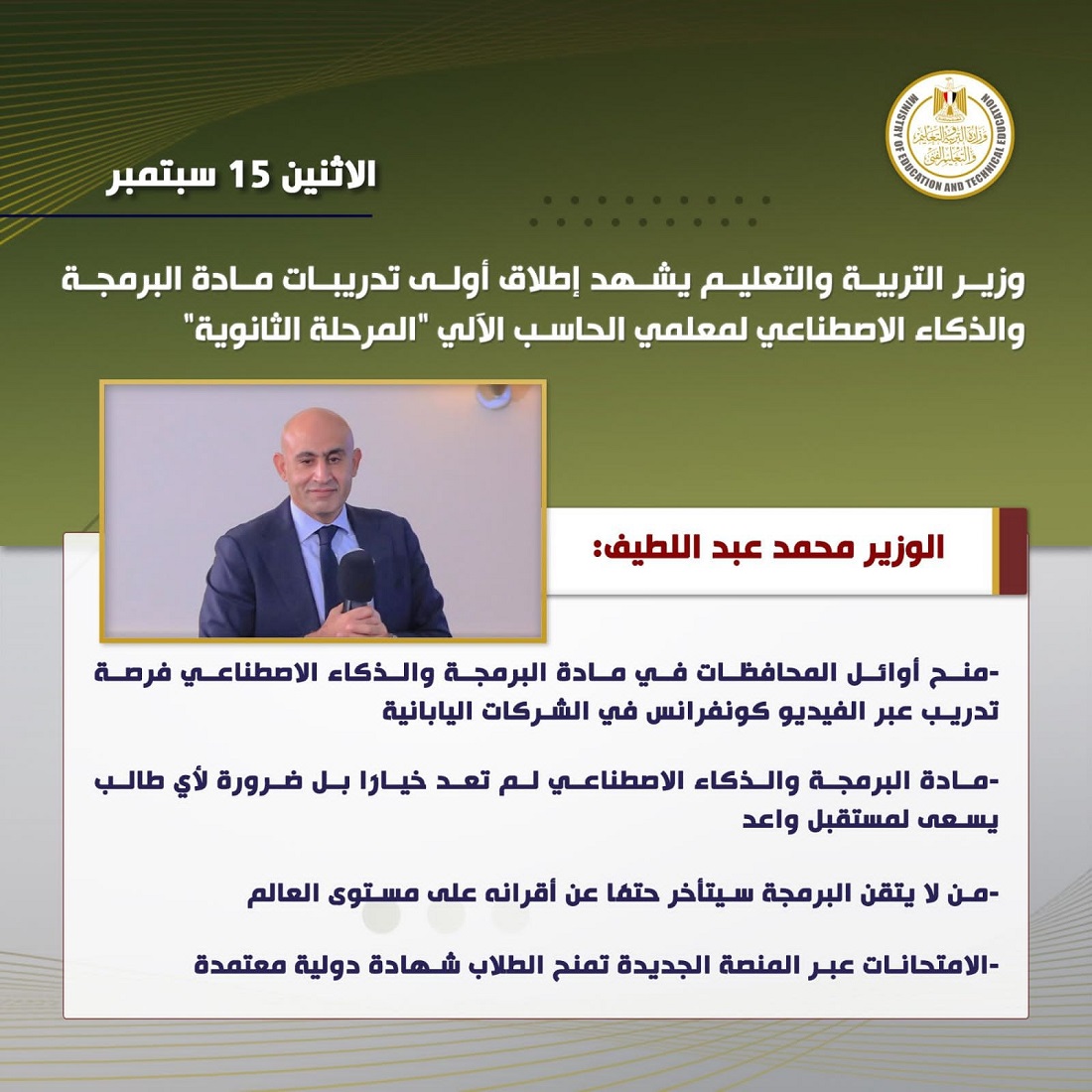 وأكد السيد الوزير محمد عبد اللطيف، خلال اللقاء، أهمية إدراك حجم المسؤولية الملقاة على عاتق الوزارة والمعلمين والمجتمع، موضحا أن مادة البرمجة والذكاء الاصطناعي لم تعد خيارًا، بل ضرورة لا غنى عنها لأي طالب يسعى لمستقبل واعد.