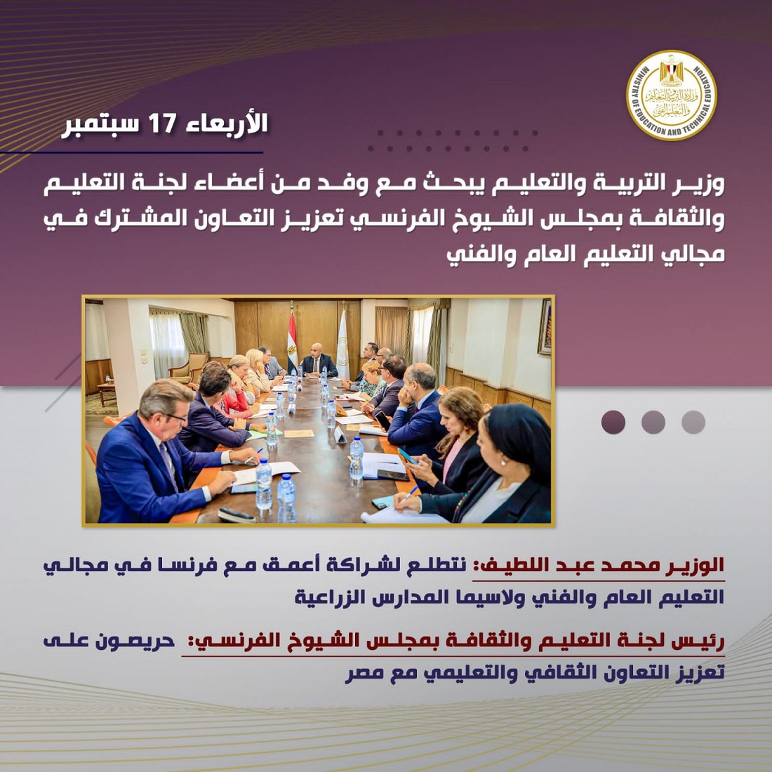 استقبل السيد محمد عبد اللطيف وزير التربية والتعليم والتعليم الفني، وفداً من أعضاء لجنة التعليم والثقافة بمجلس الشيوخ الفرنسي، وذلك لبحث سبل تعزيز التعاون المشترك في مجالات التعليم والتعليم الفني.