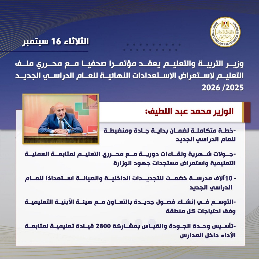 وأضاف الوزير أن الهدف الأول للوزارة هو توفير بيئة تعليمية آمنة وجاذبة، وضمان انطلاق عام دراسي منضبط بما يحقق أهداف العملية التعليمية.