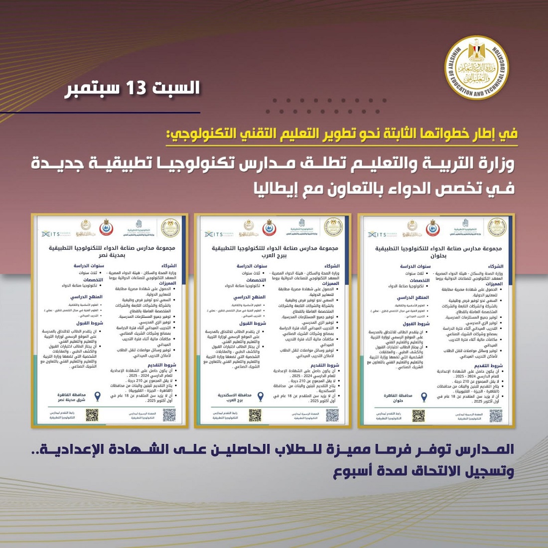 وفي ضوء هذه الجهود، تعلن وزارة التربية والتعليم والتعليم الفني، من خلال وحدة تشغيل وإدارة مدارس التكنولوجيا التطبيقية، عن إضافة مدارس جديدة في قطاع الدواء بالتعاون مع وزارة الصحة والسكان، وهيئة الدواء المصرية، والمعهد التكنولوجي للصناعات الدوائية بروما، وتضم: