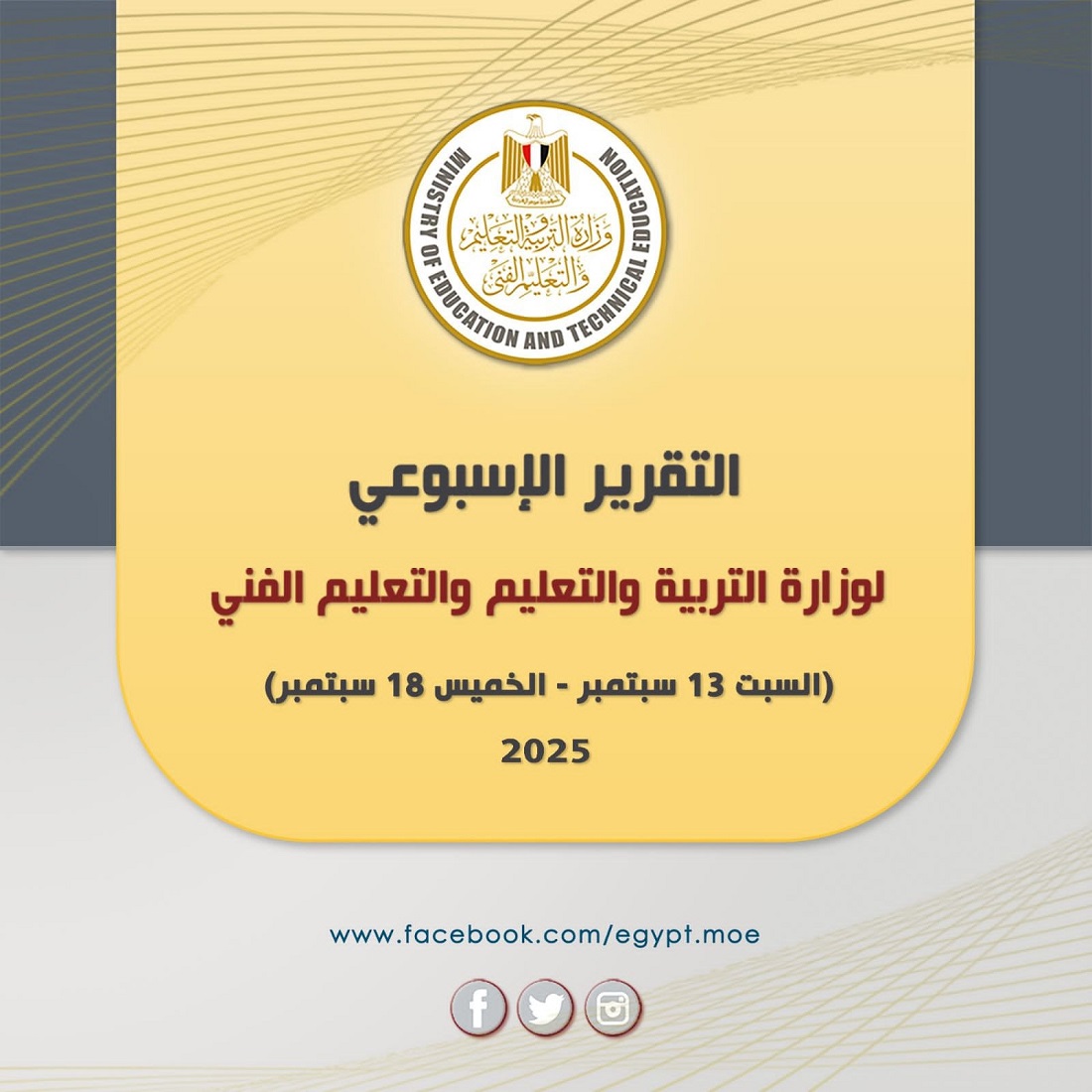 أصدر المركز الإعلامي التابع لوزارة التربية والتعليم والتعليم الفني التقرير الأسبوعي الذي يلخص أهم الأنشطة والمبادرات التي قامت بها الوزارة خلال الفترة الممتدة من السبت 13 سبتمبر إلى الخميس 18 سبتمبر 2025.