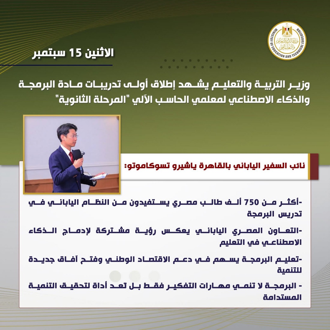 ومن جانبه، أعرب السيد ياشيرو تسوكاموتو، نائب السفير الياباني بالقاهرة، عن خالص تقديره للجهود المتميزة المبذولة في تنظيم التدريب الخاص بتدريس البرمجة والذكاء الاصطناعي، والذي يأتي في إطار التعاون المثمر بين جمهورية مصر العربية واليابان، وبالأخص في المجال التعليمي والتكنولوجي.