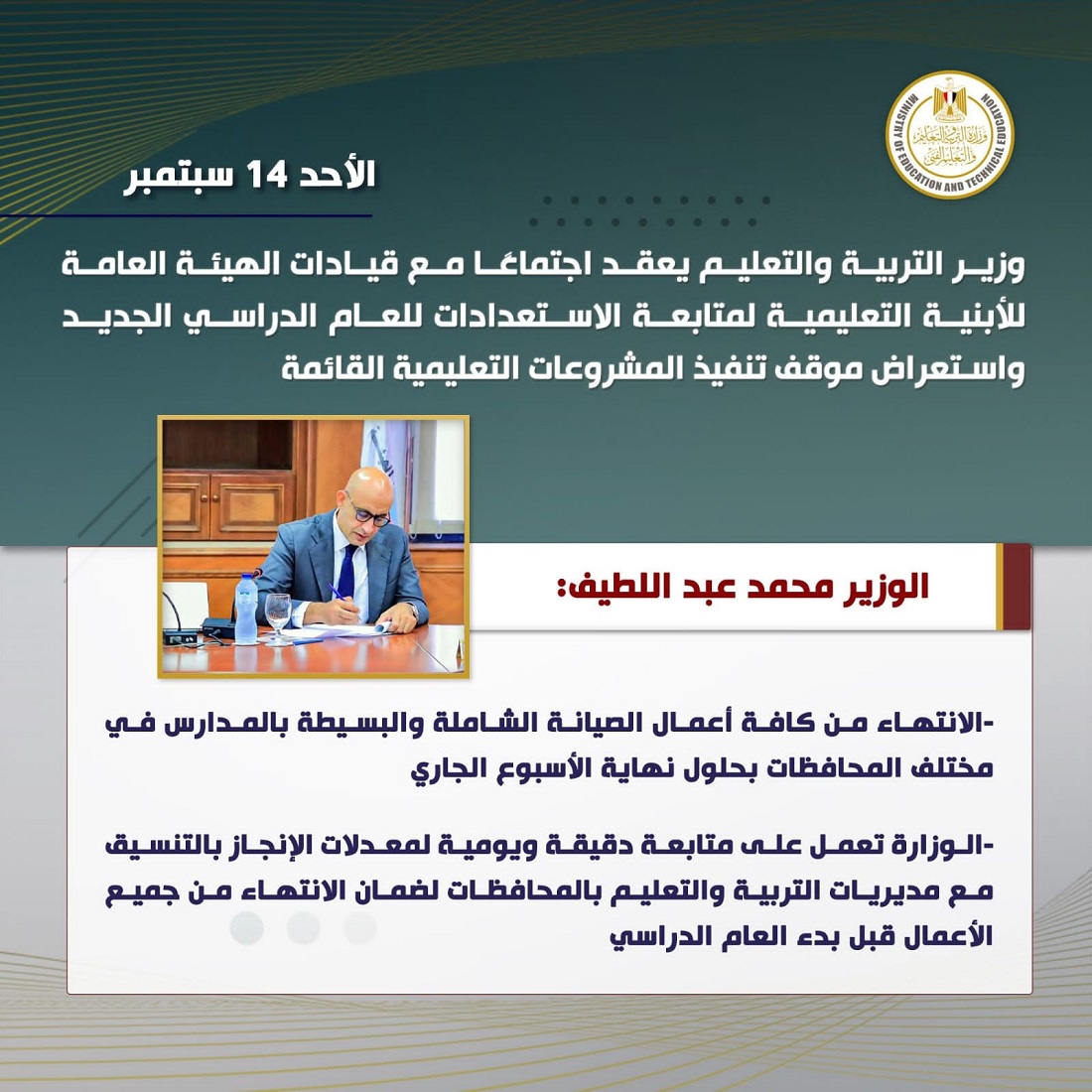 عقد السيد/ محمد عبد اللطيف وزير التربية والتعليم والتعليم الفني، اجتماعًا مع قيادات الهيئة العامة للأبنية التعليمية، لمتابعة تنفيذ خطة الهيئة للاستعدادات الجارية لاستقبال العام الدراسي الجديد، واستعراض الموقف التنفيذي للمشروعات التعليمية الجارية.