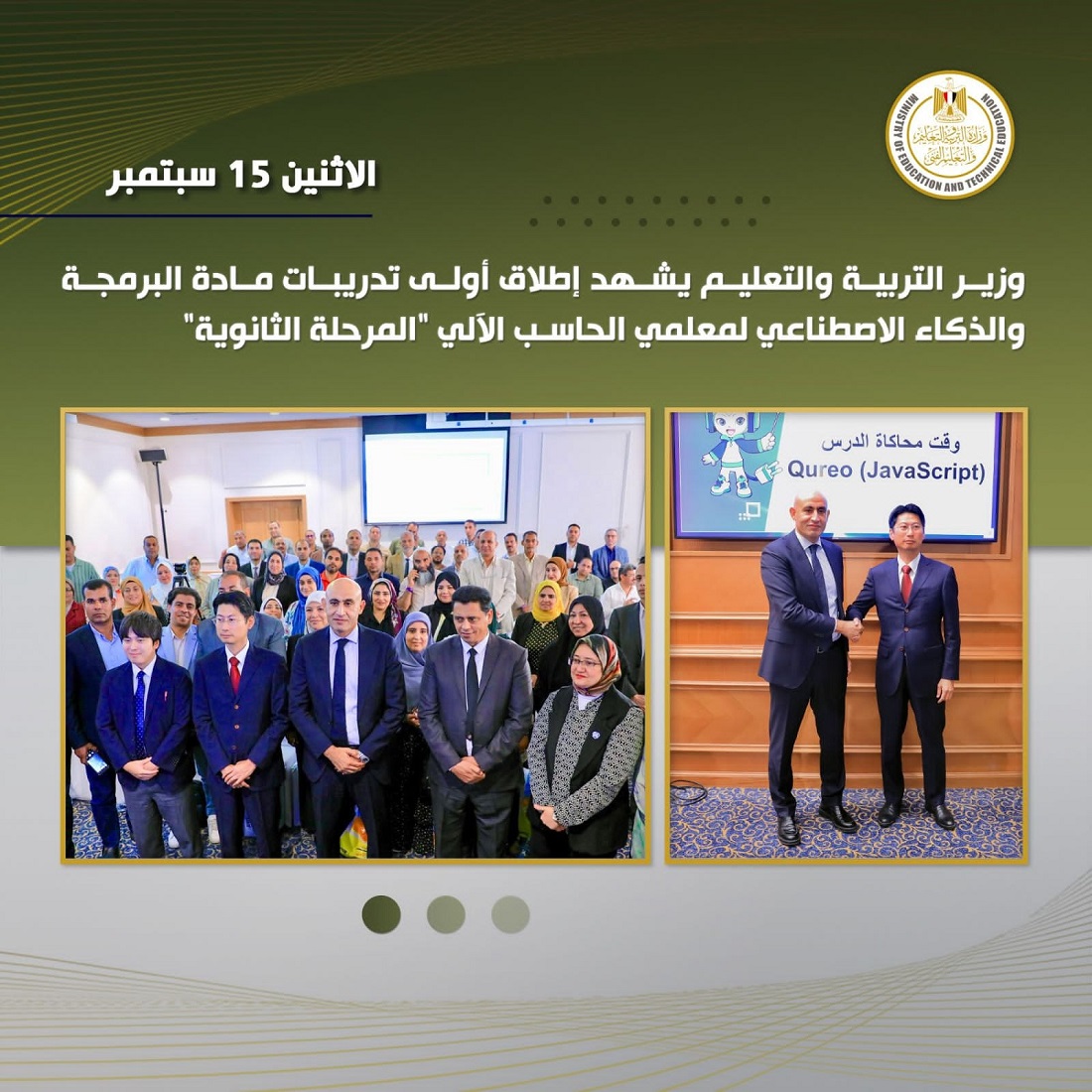شهد السيد محمد عبد اللطيف وزير التربية والتعليم والتعليم الفنى أولى التدريبات المتخصصة في مادة البرمجة والذكاء الاصطناعي، والتي استهدفت معلمي الحاسب الآلي والموجهين ومستشاري المادة وفريق التطوير التكنولوجي “سفراء التطوير”، وذلك في إطار التعاون المثمر بين مصر واليابان.