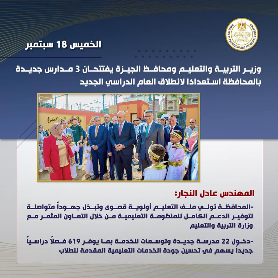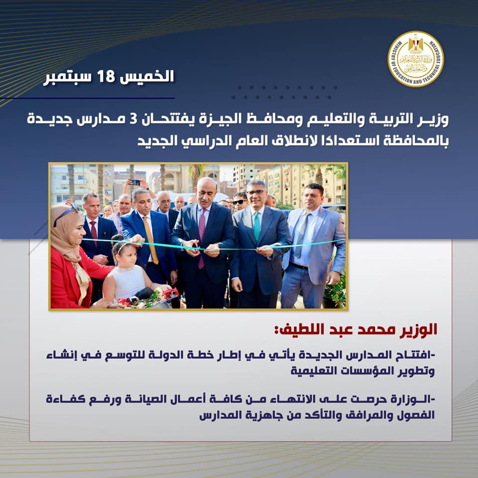 افتتح السيد/ محمد عبد اللطيف وزير التربية والتعليم والتعليم الفنى، والمهندس عادل النجار محافظ الجيزة ٣ مدارس بعدد من الإدارات التعليمية بمحافظة الجيزة، وذلك فى إطار استعدادات وزارة التربية والتعليم والتعليم الفنى للعام الدراسى الجديد، والذى من المقرر أن يبدأ يوم السبت الموافق 20 سبتمبر الجارى.