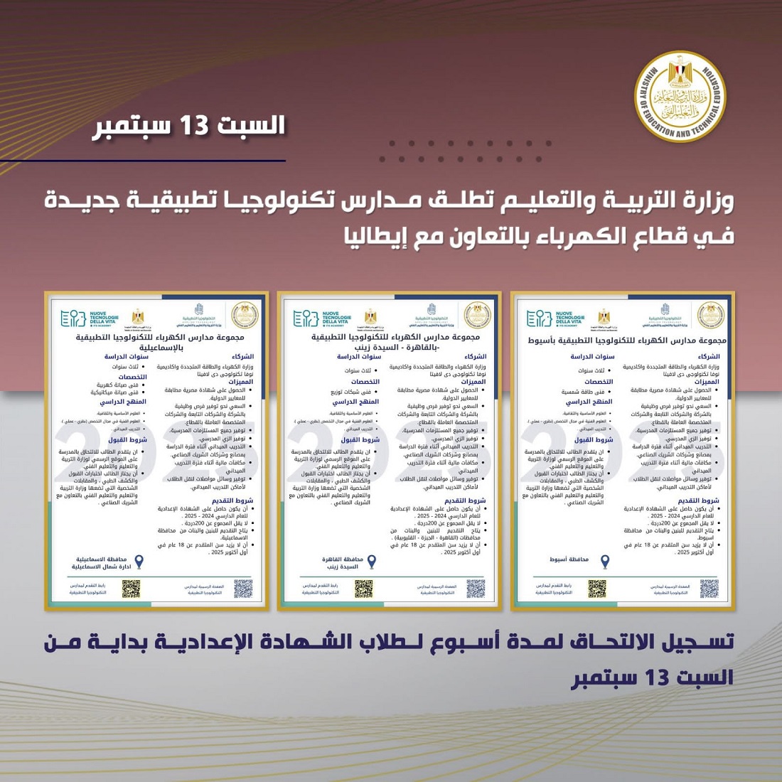وتنوه الوزارة عن أنه يمكن لطلاب الشهادة الإعدادية لعام ٢٠٢٥/٢٠٢٤، الراغبين في الالتحاق بهذه المدارس التقديم عن طريق التسجيل خلال أسبوع من اليوم عبر الرابط التالي:
