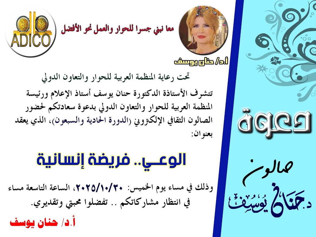 برعاية المنظمة العربية للحوار والتعاون الدولي، استضافت منصة صالون حنان يوسف الثقافي فعالية جديدة بعنوان «الوعي فريضة إنسانية»، بمناسبة الاحتفال بالأسبوع العالمي للدراية الإعلامية والمعلوماتية الذي تقيمه الأمم المتحدة سنويًا، خلال الفترة من 24 أكتوبر وحتى 31 مايو.