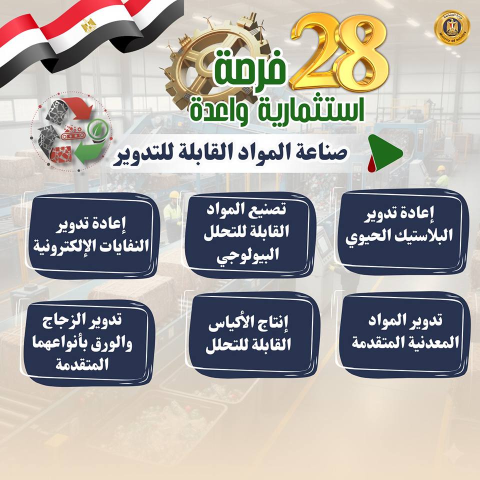 18- صناعة المواد القابلة للتدوير (إعادة تدوير البلاستيك الحيوي- تصنيع المواد القابلة للتحلل البيولوجي – إعادة تدوير النفايات الإلكترونية- تدوير المواد المعدنية المتقدمة- إنتاج الأكياس القابلة للتحلل- تدوير الزجاج والورق بأنواعهما المتقدمة)