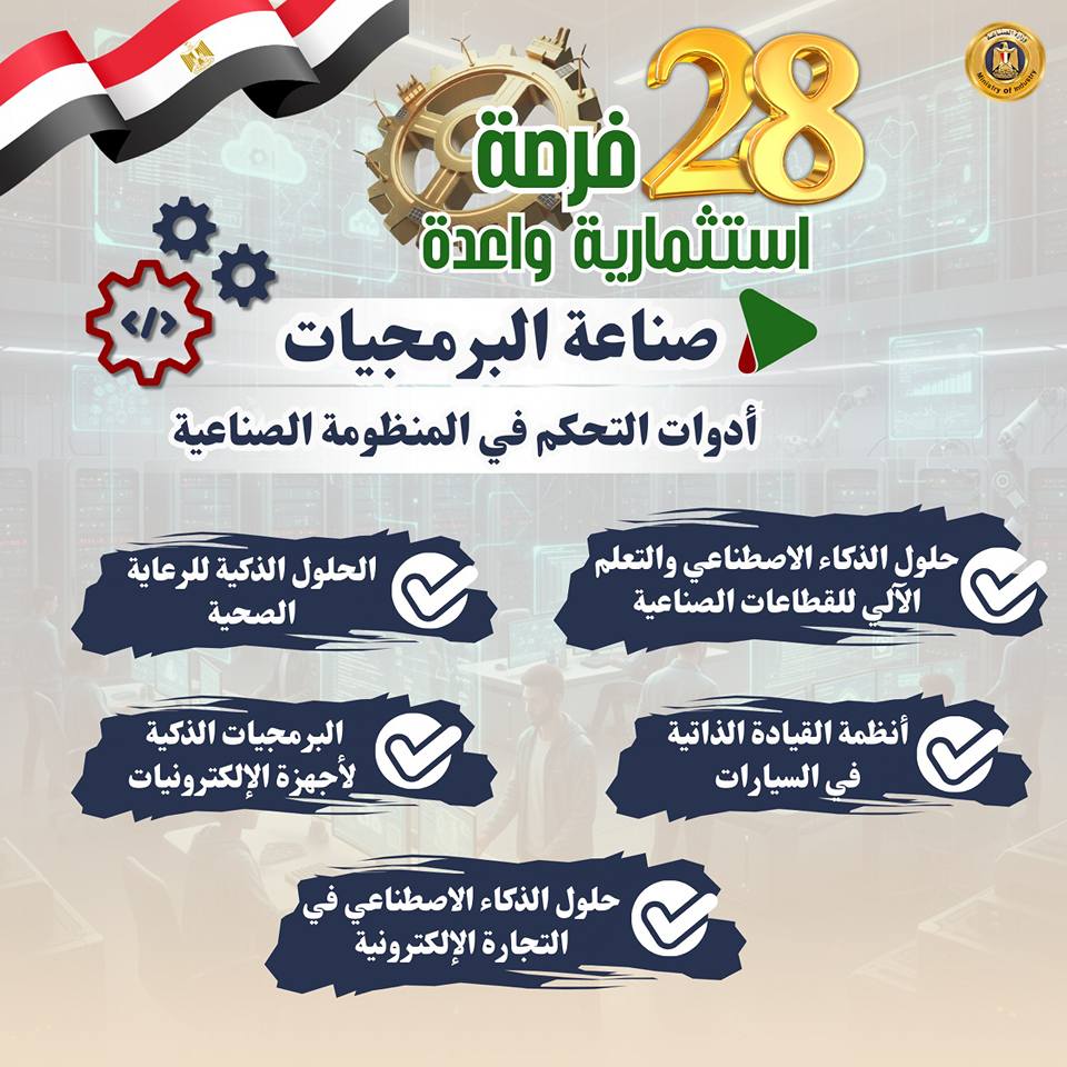 3- صناعة البرمجيات وأدوات التحكم في المنظومة الصناعية (حلول الذكاء الاصطناعي والتعلم الآلي للقطاعات الصناعية- الحلول الذكية للرعاية الصحية- أنظمة القيادة الذاتية في السيارات- البرمجيات الذكية لأجهزة الإلكترونيات- حلول الذكاء الاصطناعي في التجارة الإلكترونية).
