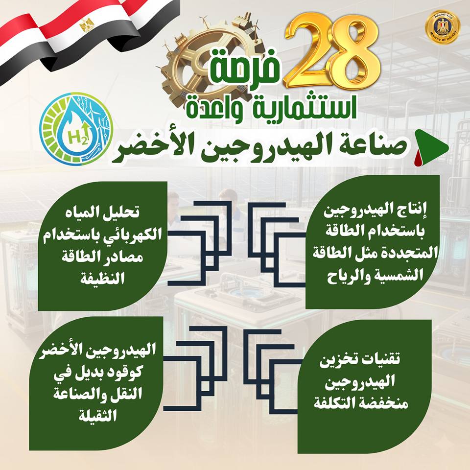 23- صناعة الهيدروجين الأخضر (إنتاج الهيدروجين باستخدام الطاقة المتجددة مثل الطاقة الشمسية والرياح- تحليل المياه الكهربائي باستخدام مصادر الطاقة النظيفة- تقنيات تخزين الهيدروجين منخفضة التكلفة – الهيدروجين الأخضر كوقود بديل في النقل والصناعة الثقيلة)