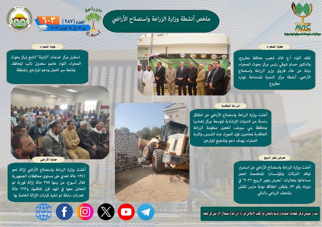بينما أعلنت وزارة الزراعة واستصلاح الأراضي عن انطلاق سلسلة من الندوات الإرشادية الموسعة بمركز إهناسيا بمحافظة بني سويف، لتفعيل منظومة الزراعة التعاقدية لمحاصيل: فول الصويا، عباد الشمس، والذرة الصفراء، بهدف دعم وتشجيع المزارعين، كما أعلنت الوزارة عن استمرار توافد الشركات والمؤسسات المتخصصة لحجز مساحاتها بفعاليات “معرض زهور الربيع 2026” في دورته رقم 93، والمقرر انطلاقه نهاية مارس المقبل بالمتحف الزراعي بالدقي