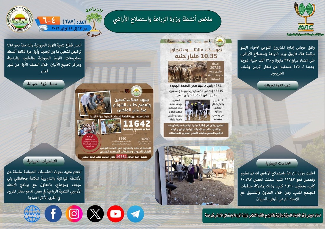 أصدر مركز المعلومات الصوتية والمرئية بـ وزارة الزراعة واستصلاح الأراضي، «الانفوجراف الأسبوعي» في نسخته رقم 287 حول الحصاد الاسبوعي لأهم أنشطة الوزارة، خلال الاسبوع الماضي في الفترة من 13 وحتى 19 فبراير الجاري، كما أصدر المركز ايضا ملخصا بالفيديو، حول انشطة الوزارة خلال نفس الفترة.