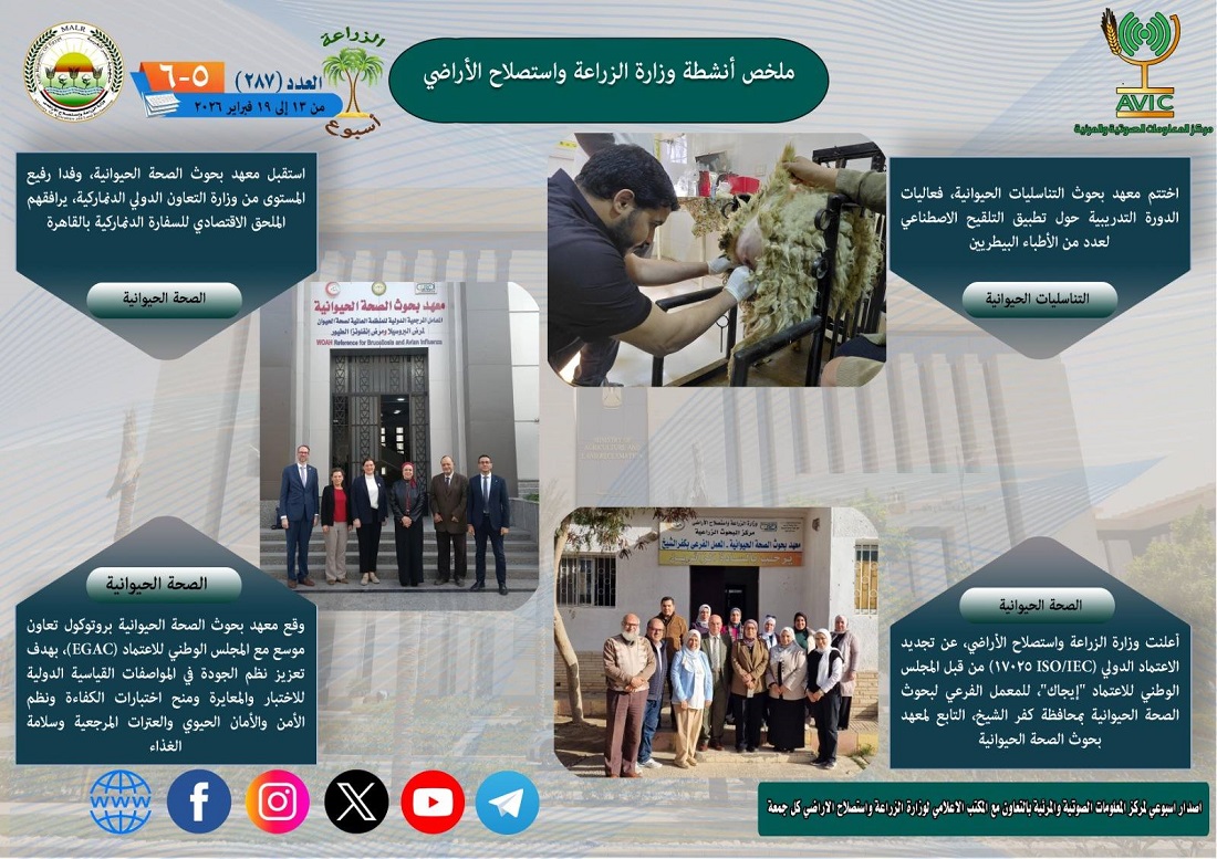 فيما اختتم معهد بحوث التناسليات الحيوانية سلسلة من الأنشطة الميدانية والتدريبية المكثفة بمحافظتي بني سويف وسوهاج، بالتعاون مع برنامج الاتحاد الأوروبي للتنمية الزراعية في مصر، لدعم صغار المربين في القرى الأكثر احتياجا، كما اختتم أيضا، فعاليات الدورة التدريبية حول تطبيق التلقيح الاصطناعي لعدد من الأطباء البيطريين، كما استقبل معهد بحوث الصحة الحيوانية، وفدا رفيع المستوى من وزارة التعاون الدولي الدنماركية، يرافقهم الملحق الاقتصادي للسفارة الدنماركية بالقاهرة.