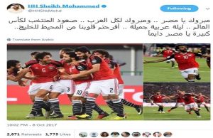 هنأ صاحب السمو الشيخ محمد بن راشد آلِ مكتوم، نائب رئيس دولة الإمارات ورئيس مجلس الوزراء حاكم دبي المنتخب مصري بعد فوزه على الكونغو والصعود إلي كأس العالم 2018 بروسيا.