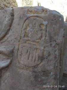 أما عن الرأس التي تم العثور عليها بالممر الخارجي الخلفي للمعبد، فلا تزال تحتفظ بآثار للالوان، حيث تظهر بقايا اللون الأحمر على الوجه واللون الأصفر على الجبين عند بداية التاج، كما يزين الجبين حية الكوبرا رمز الحماية الملكية، ويبلغ ارتفاعها حوالي 70 سم وعرضها 56 سم تقريبا بينما يبلغ سمكها حوالي 30 سم تقريبا.